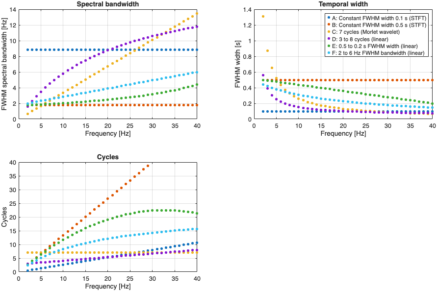 Many software packages for wavelet-based time-frequency analysis of M/EEG data use "cycles" as unit to define the temporal or spectral resolution of Morlet-type wavelets. Besides causing confusion with wavelet duration, "cycles" as unit is highly opaque and inaccessible and the implications of changes to this parameter are not always obvious. For example, a linear change in cycles from low to high frequencies, as is commonly done, could mislead one into assuming that the wavelet temporal or spectral resolution changes linearily with cycles. However, this is not the case. Cohen (2019) suggested to better define the resolution as the "full width at half maximum" (FWHM) of the Gaussian function (cf., Figure 1). He implemented this by adjusting the functions used for wavelet generation in the time or frequency domain. While valuable, this suggestion cannot (easily) be applied to existing software packages.