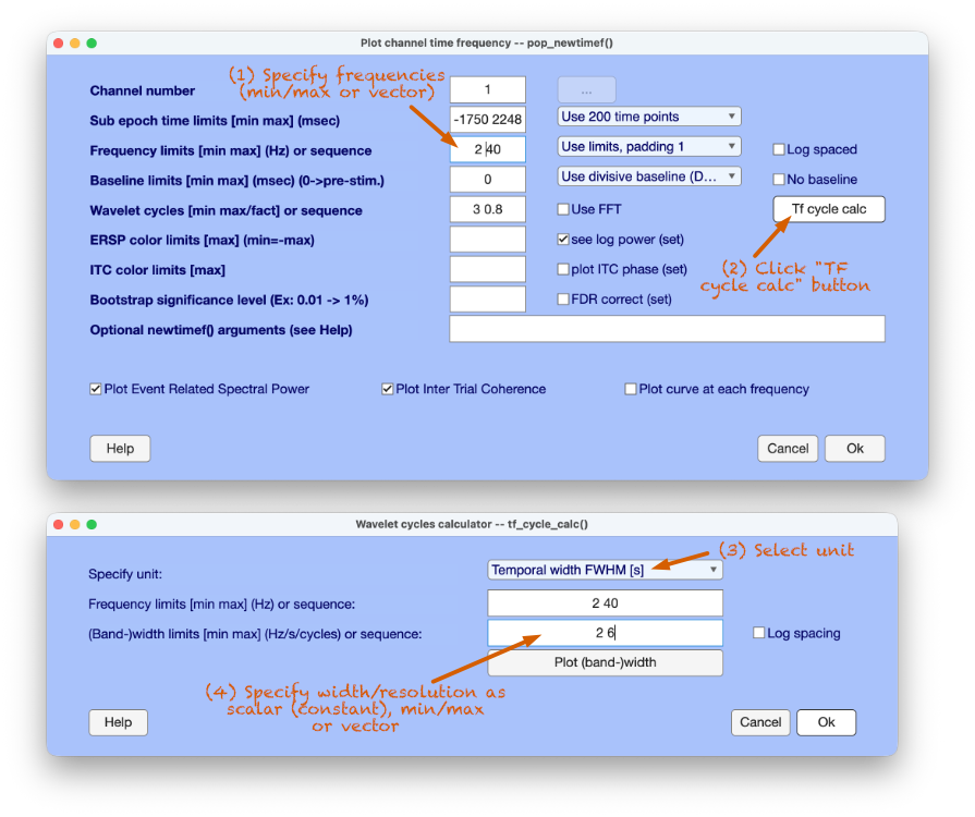 The TF cycles calculator computes the cycles parameter from different units of temporal or spectral resolution, including temporal and spectral FWHM, σt and σf, 2 σt and 2 σf per wavelet center frequency. The calculator can also convert from cycles to any unit and report and visualize the wavelet resolution per center frequency. This is useful for appropriately reporting resolution in publications, for example. The calculator can be used on the MATLAB command line or as an EEGLAB GUI function, which can be called from the pop_newtimef EEGLAB GUI.